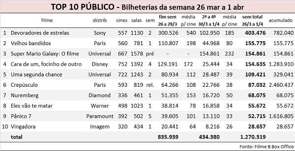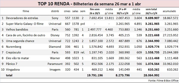 O grande campeão foi Devoradores de estrelas (Sony), que chegou a um acumulado de 782 mil em público e R$ 18,8 milhões em renda. Depois de um fim de semana de crescimento, a ficção científica com Ryan Gosling manteve uma boa sustentação na segunda e na terça-feira, com quedas mínimas de cerca de 5%. Na quarta-feira, porém, a retração chegou a 20%. Isso indica que a presença maciça de Super Mario Galaxy, em cartaz em 560 cinemas e 1,5 mil salas, afetou até os títulos com públicos-alvo bem diferentes.